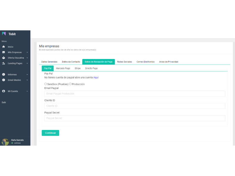 - Pasarela de pagos Visa, Mastercard, Paypal, Stripe